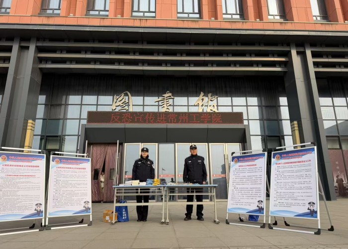 12月17日上午,常州市公安局反恐支队、新北区公安分局内保反恐大队、新桥派出所“反恐宣传进常州工学院”活动在学校图书馆南门和后勤楼东侧广场举办。此次活动宣传主题为“全民反恐 共创平安”,通过现场讲解、发放宣传资料、赠送小礼品等形式,向广大师生员工宣传《中华人民共和国反恐怖主义法》。通过此次活动,增强了师生反恐防暴的安全意识,提高了师生在遭遇各类恐怖袭击时的自我保护能力。